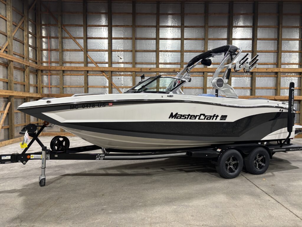 2020 Mastercraft XT22, Upgraded 6.0L Ilmor, ZFT4 tower easy fold, clamping boardracks, stereo with amp and sub, tower speakers, custom exterior black mica metal flake, custom black cool feel vinyl, convertible flip seat, over the tower cover, bimini sun top, removeable carpet, and tandem axle trailer. 445 hours.